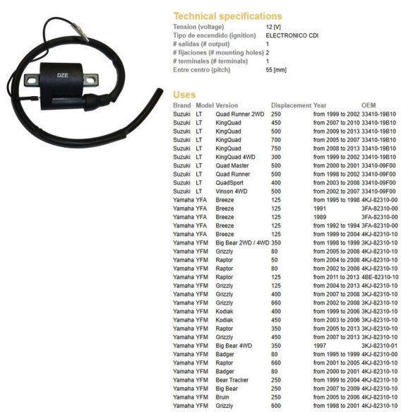 DZE CEWKA ZAPŁONOWA SUZUKI DRZ 400 '00-'12, KING QUAD 700/750 '05-'13, YAMAHA GRIZZLY/RAPTOR/KODIAK 350/400/450/600/660