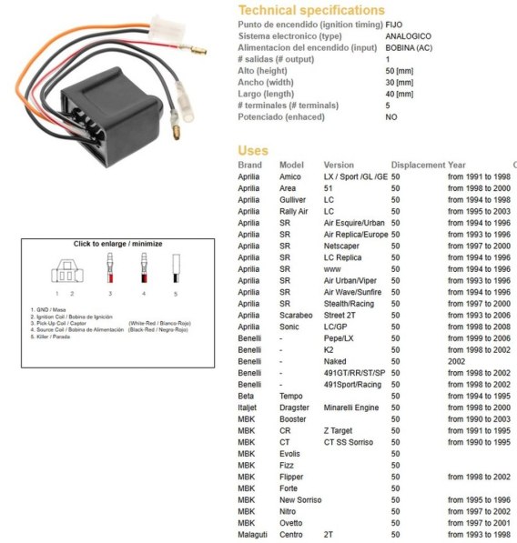 Dane techniczne Rozrząd zapłonu (rozrząd zapłonu) STAŁY Układ elektroniczny (typ) ANALOGOWY Zasilanie zapłonu (wejście) COIL (AC) # Wyjścia (# output) 1 Wysokość 50 [mm Szerokość 30 [mm] Długość 40 [mm] Długość 40 [mm] # zaciski (# terminals) # terminali (# terminali) 5 Rozszerzony NO Zastosowania Aprilia Amico LX / Sport /GL /GE 50 od 1991 do 1998 r. Aprilia Area 51 50 od 1998 do 2000 Aprilia Gulliver LC 50 od 1994 do 1998 r. Aprilia Rally Air LC 50 od 1995 do 2003 r. Aprilia SR Air Esquire/Urban 50 od 1994 do 1996 roku Aprilia SR Air Replica/Europe 50 w latach 1993-1996 Aprilia SR Netscaper 50 od 1997 do 2000 roku Aprilia SR LC Replica 50 od 1994 do 1996 Aprilia SR www 50 od 1994 do 1996 Aprilia SR Air Urban/Viper 50 od 1993 do 1996 Aprilia SR Air Wave/Sunfire 50 w latach 1994-1996 Aprilia SR Stealth/Racing 50 od 1997 do 2000 roku Aprilia Scarabeo Street 2T 50 od 1993 do 2006 roku Aprilia Sonic LC/GP 50 od 1998 do 2008 roku Benelli - Pepe/LX 50 od 1999 do 2006 roku Benelli - K2 50 od 1998 do 2002 Benelli - Naked 50 2002 Benelli - 491GT/RR/ST/SP/SP 50 od 1998 do 2002 Benelli - 491Sport/Racing 50 od 1998 do 2002 r. Beta Tempo 50 od 1994 do 1995 Italjet Dragster Minarelli Engine 50 od 1998 do 2000 r. MBK Booster 50 od 1990 do 2003 MBK CR Z Target 50 od 1991 do 1995 r. MBK CT SS Sorriso 50 od 1990 do 1995 r. MBK Evolis 50 MBK Fizz 50 MBK Flipper 50 od 1998 do 2002 r. MBK Forte 50 MBK New Sorriso 50 od 1995 do 1996 r. MBK Nitro 50 od 1997 do 2002 r. MBK Ovetto 50 od 1997 do 2001 r. Malaguti Centro 2T 50 od 1993 do 1998 r. Malaguti F10 Jetline 50 od 1992 do 1994 r. Yamaha BW R 50 2001 Yamaha BW Bump 50 od 1997 do 1998 r. Yamaha BW Next Generation 50 od 1997 do 2002 r. Yamaha BW Original 50 od 1997 do 2002 Yamaha CR Z 50 od 1991 do 1995 Yamaha CT S 50 od 1990 do 1995 Yamaha CW RS SPY 50 od 1995 do 1998 r. Yamaha CW BWS Original Euro 50 2002 Yamaha EW Slider 50 od 2000 do 2002 r. Yamaha Jog CY50 4GF1 50 od 1990 3KJ-85540-01 Yamaha YA R Axis 50 od 1995 do 1996 r. Yamaha YH Why 50 od 1998 do 2002 r. Yamaha YM Breeze 50 od 1994 do 1995 r. Yamaha YN R Neos 50 od 1997 do 2001 r. Yamaha YQ Aerox/R 50 od 1997 do 2002 r.