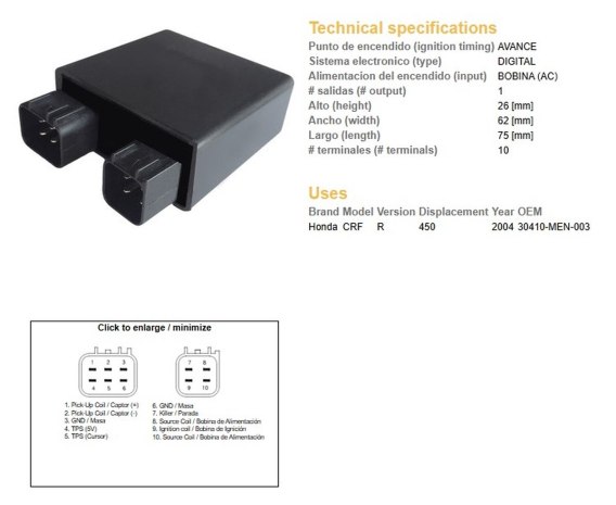 Dane techniczne Rozrząd zapłonu AVANCE Układ elektroniczny (typ) CYFROWY Zasilanie zapłonu (wejście) COIL (AC) Wysokość 26 [mm Szerokość 62 [mm] Długość 75 [mm] Długość 75 [mm] # zaciski (# terminals) # terminali (# terminali) 10 Zastosowania Honda CRF R 450 2004 30410-MEN-003