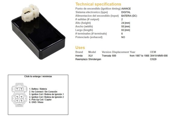 Dane techniczne Rozrząd zapłonu AVANCE Układ elektroniczny (typ) CYFROWY Zasilanie zapłonu (wejście) BATERIA (DC) # Wyjścia (# wyjść) 2 Wysokość 24 [mm Szerokość 55 [mm] Długość 93 [mm] Długość 93 [mm] # terminali (# terminali) # terminali (# terminali) 6 Rozszerzony NO Zastosowania Honda XLV Transalp 600 od 1987 do 1988 30410-MM9-008 Zamiennik Shindengen CI529