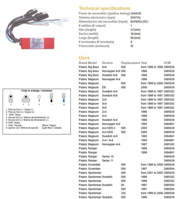 Dane techniczne Rozrząd zapłonu AVANCE Układ elektroniczny (typ) CYFROWY Zasilanie zapłonu (wejście) BATERIA (DC) Wysokość 23 [mm Szerokość 38 [mm] Długość 68 [mm] Długość 68 [mm] # zaciski (# terminals) Rozszerzone SI Zastosowania Polaris Big Boss 6x6 500 od 1998 do 1999 3085639 Polaris Big Boss Norwegian 6x6 500 1998 3085639 Polaris Big Boss Swedish 6x6 500 1998 3085639 Polaris Magnum Norwegian 4x4 1998 3085639 Polaris Magnum 500 od 1999 do 2000 3085639 Polaris Magnum EB 500 2000 3085639 Polaris Magnum szwedzki 4x4 od 1996 do 1997 3085382 Polaris Magnum Swedish 6x6 od 1996 do 1997 3085382 Polaris Magnum 2x4 od 1996 do 1997 3085382 Polaris Magnum 4x4 od 1996 do 1997 3085382 Polaris Magnum 6x6 od 1996 do 1997 3085382 Polaris Magnum 2x4 1998 3085639 Polaris Magnum 4x4 1998 3085639 Polaris Magnum szwedzki 4x4 1998 3085639 Polaris Magnum Norwegian 4x4 1995 3084691 Polaris Magnum 4x4 HDS II 500 2000 3085639 Polaris Magnum 4x4 HDS 500 2000 3085639 Polaris Magnum szwedzki 4x4 1995 3084691 Polaris Magnum 2x4 / 4x4 1995 3084691 Polaris Magnum Norwegian 4x4 1997 3085382 Polaris Ranger 1999 3085639 Polaris Ranger 1999 3084691 Polaris Ranger Seria 10 3085639 Polaris Ranger Series 11 3085639 Polaris Scrambler 500 od 1998 do 2000 3085639 Polaris Scrambler 500 1997 3085564 Polaris Sportsman 400 od 2001 do 2002 3085639 Polaris Sportsman Swedish 500 1996 3085382 Polaris Sportsman 500 1996 3085382 Polaris Sportsman Swedish 50 1997 3085564 Polaris Sportsman 500 1997 3085564 Polaris Sportsman 335 od 1999 do 2000 3085639 Polaris Sportsman Swedish 500 1998 3085639 Polaris Sportsman 6x6 2000 3085639 Polaris Sportsman 500 od 1998 do 2000 3085639 Polaris Sportsman DUSE 500 2001 3085639 Polaris Sportsman RSE 500 od 1999 do 2000 3085639 Polaris Worker 500 1999 3085639 Polaris Worker 335 1999 3085639 Polaris Xplorer 500 1997 3085564
