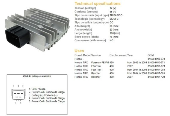 DZE REGULATOR NAPIĘCIA HONDA TRX 400 FOUR TRAX '04-'07; TRX 400 RANCHER '04-'07; TRX 450 FE/FM FOREMAN '02-'04 (35A) (31600-HN7-
