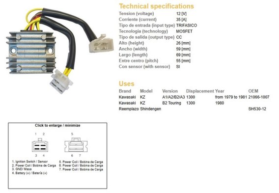 Dane techniczne Napięcie 12 [V Prąd 35 [A] Typ wejścia Typ wejścia (typ wejścia) TRóJFAZOWE Technologia (technologia) MOSFET Typ wyjścia DC Wysokość 26 [mm] Szerokość 59 [mm] Szerokość 59 [mm] Długość 69 [mm] Długość 69 [mm Od środka do środka (skok) 55 [mm] Z czujnikiem SI Zastosowanie Kawasaki KZ A1/A2/B2/A3 1300 od 1979 do 1981 21066-1007 Kawasaki KZ B2 Touring 1300 1980 Zamiennik Shindengen SH530-12 Gwarancja dotyczy tylko montażu w serwisie wyspecjalizowanym w obsługę instalacji elektrycznych - po przedstawieniu zaświadczenia z serwisu montującego.