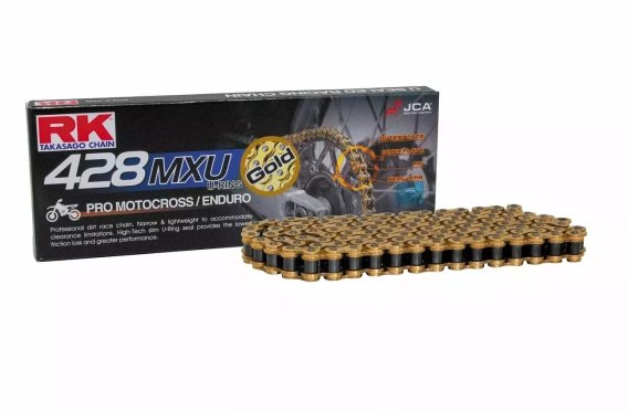 • RK ŁAŃCUCH NAPĘDOWY (ENDURO) GB428MXU-136 (U-RING) ZAPINKA (CL) W ZESTAWIE KOLOR ZŁOTY (POJEMNOŚĆ: DO 150 CCM) (27 KN)